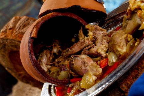 لحم موزة الخروف مطبوخ على الطريقة التركية مع الخضروات المشكلة من انواع الفلفل والطماطم والبصل