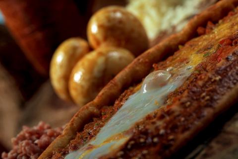 الفطيرة التركية المميزة مكونة من اللحم المشكل من اللحم البقري ولحم الخروف وجبنة القشقوان متبلة بالبهارات التركية المميزة