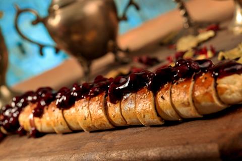 لحم بقر مع لحم خروف متبل بالبهارات ومنقوع باللبن الرايب مغلف بالخبز الطازج ومشوي على الفحم ومغطى بصوص وحبات الكرز