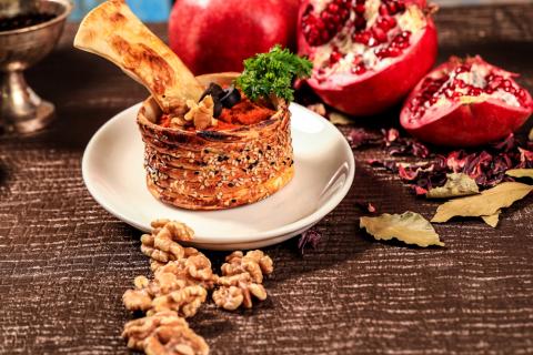خليط من الجوز المطحون مع صلصة البندورة والفلفل الحار وزيت الزيتون تقدم مع لخبز المحمص