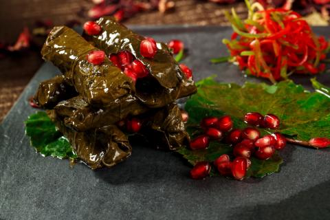 ورق العنب الطازج محشو بخلطة لالية مع البندورة والبصل يقدم مع حبيبات الرمان الطازجة