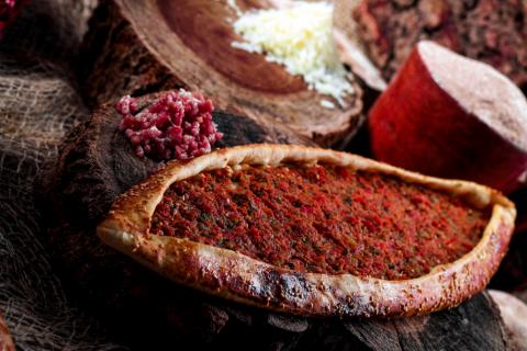 Turkish style Fateer served with minced beef and mutton, sprinkled with distinctive hot Turkish spices and salads