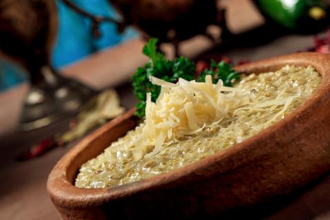 Cooked Frika with cream and fresh mushrooms, served with parmesan cheese